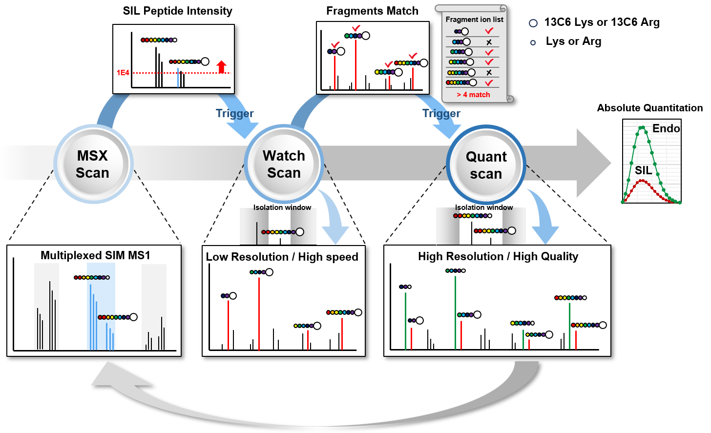 Uses Ultra-Narrow Isolation Windows to minimize interference in complex matrices (e.g., plasma). It delivers PRM-level quantitative accuracy (Absolute Quantification) with the scale of discovery proteomics.